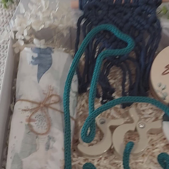 Delight in a charming dinosaur-themed baby hamper crafted in subtle blues and greens. This lovingly handmade gift box is the perfect surprise for new arrivals, baby showers, or a heartfelt celebration.