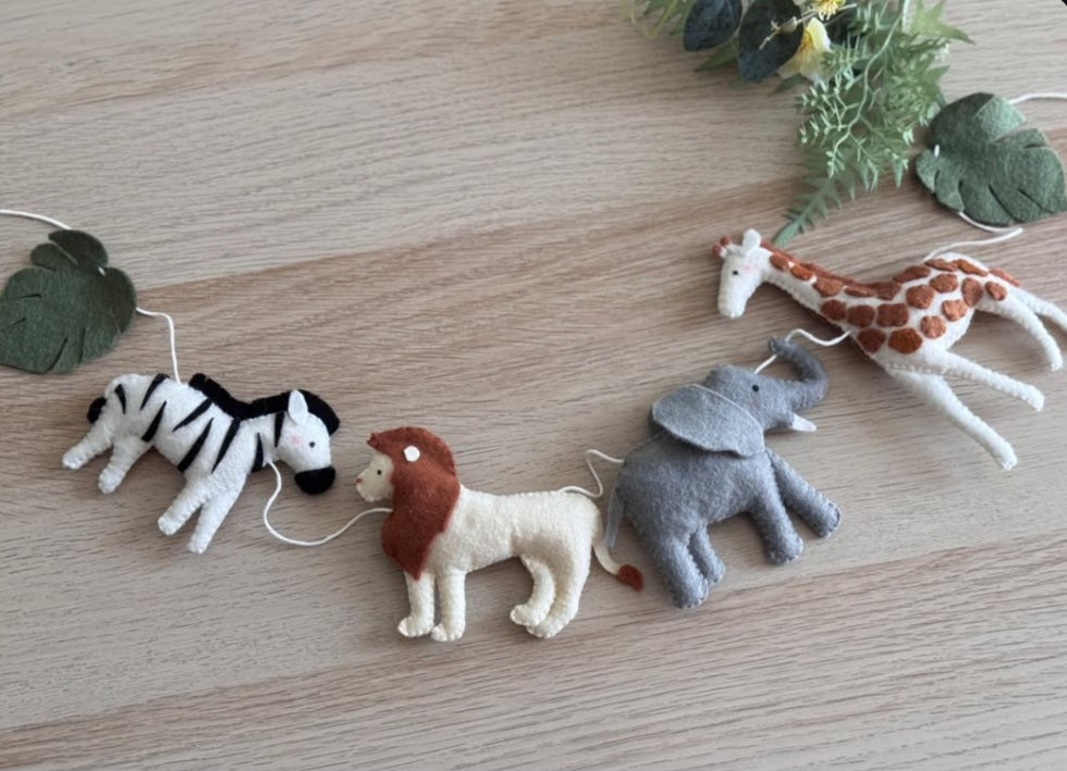 Embark on a gentle adventure with Pink Mallows’ Jungle Safari Bunting, custom handmade by Little Peanut for Pink Mallows baby collection. This cotton felt bunting features four beloved jungle animals in soft, coordinating colours, making it a charming addition to any nursery or kid’s room—whether for girls or boys.