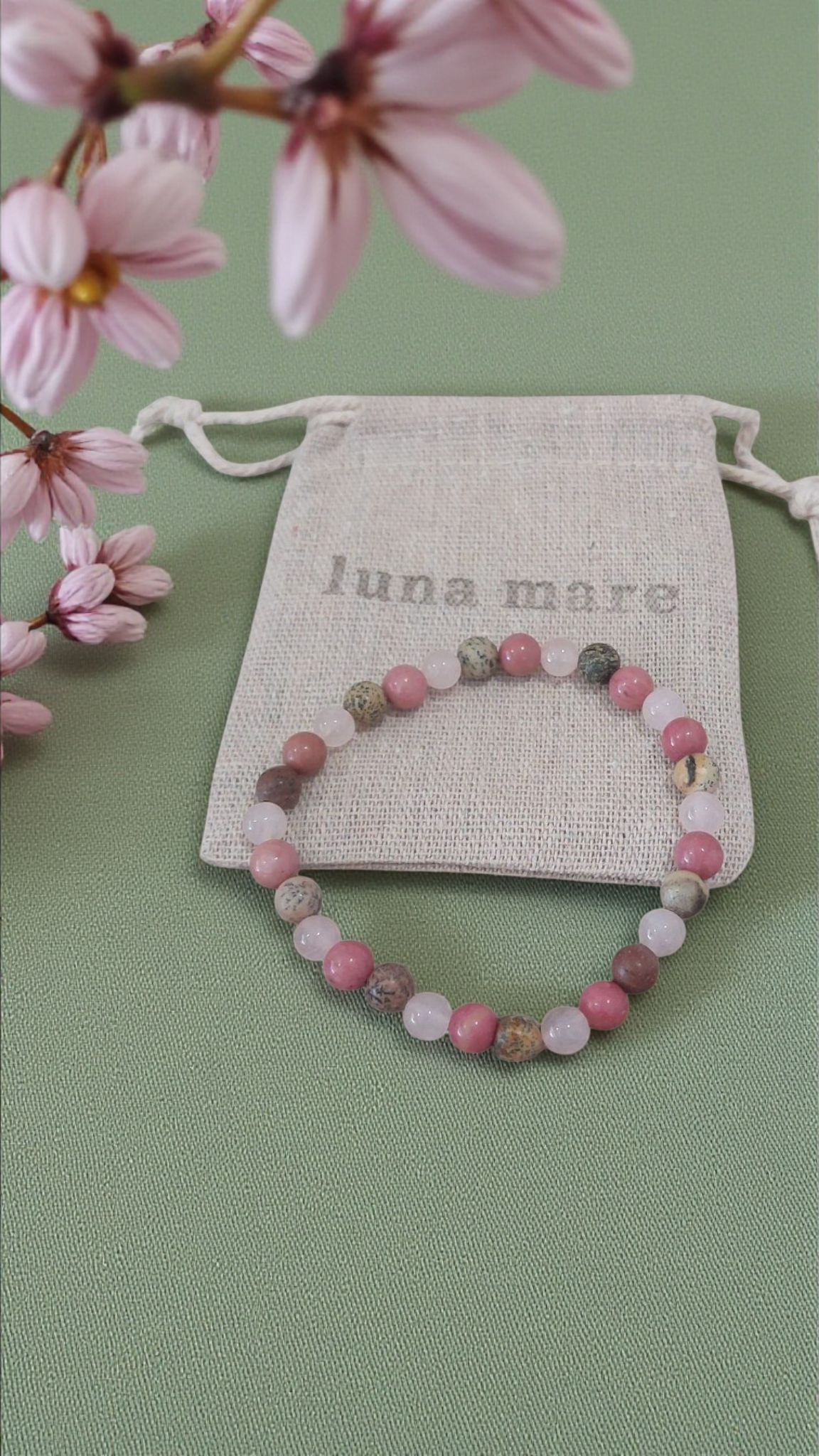 Elevate your style with this exquisite, handcrafted bracelet, meticulously created by Luna Mare for Pink Mallow. Each piece is thoughtfully assembled with love and care, featuring a stunning combination of pink-hued gemstones personally selected for their beauty and their powerful energies.