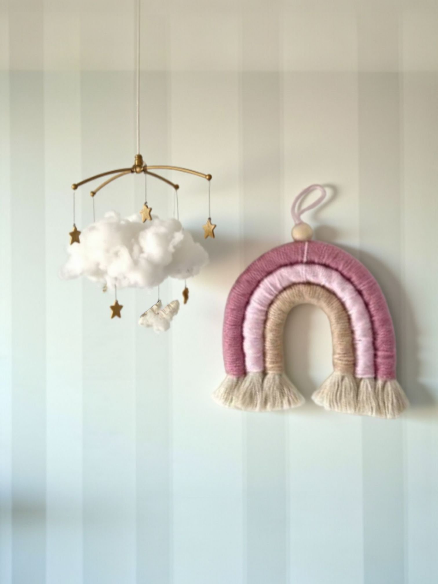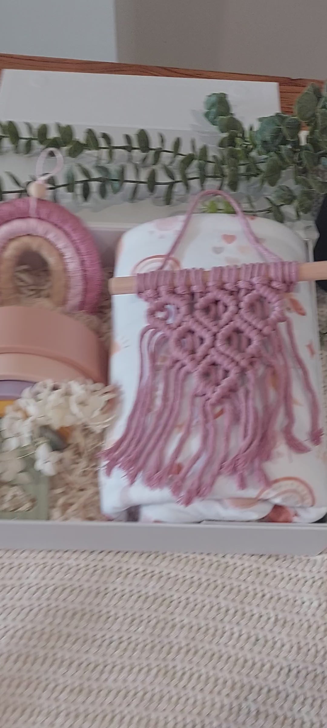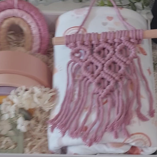 Delicate, artisanal macramé décor to brighten nurseries or living spaces with a touch of blush rose.