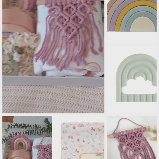 The Pink Mallow Rainbow Hamper arrives beautifully packaged, ready to gift. Its multi-coloured pastel palette and gentle textures create a harmonious and joyful unboxing moment for new parents and their little one.
